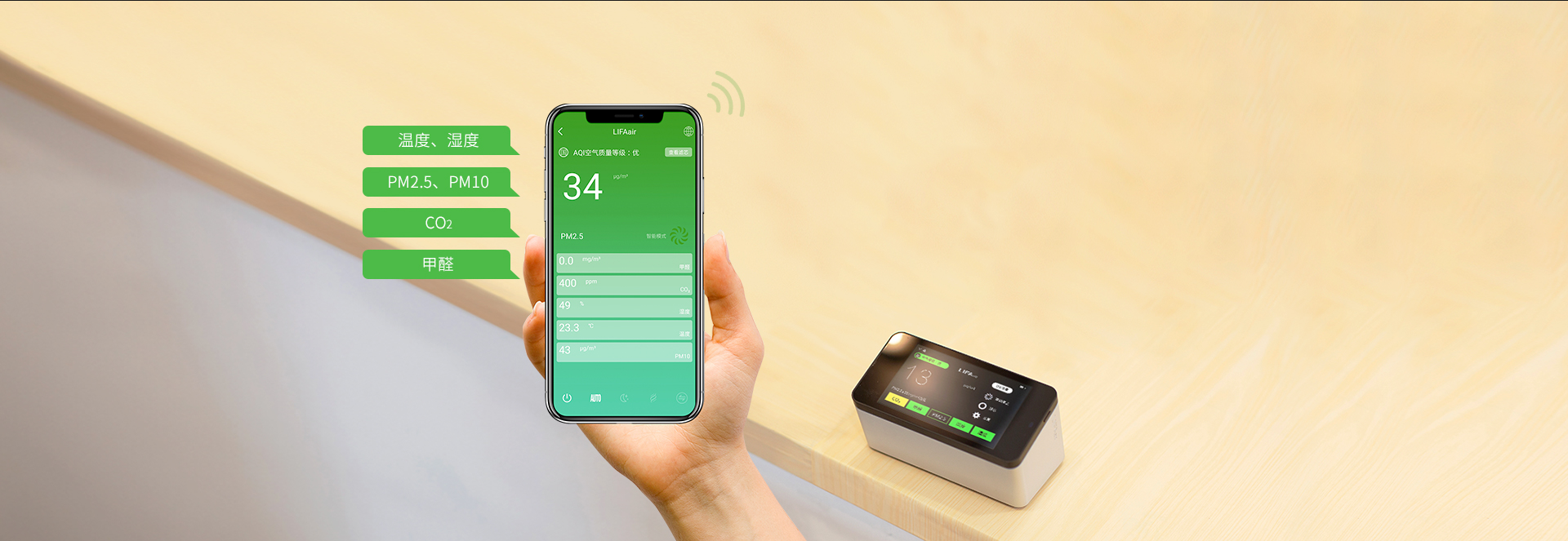 分体式控制器集成温度、湿度、二氧化碳、甲醛、 激光PM2.5传感器,多项空气参数一目了然。